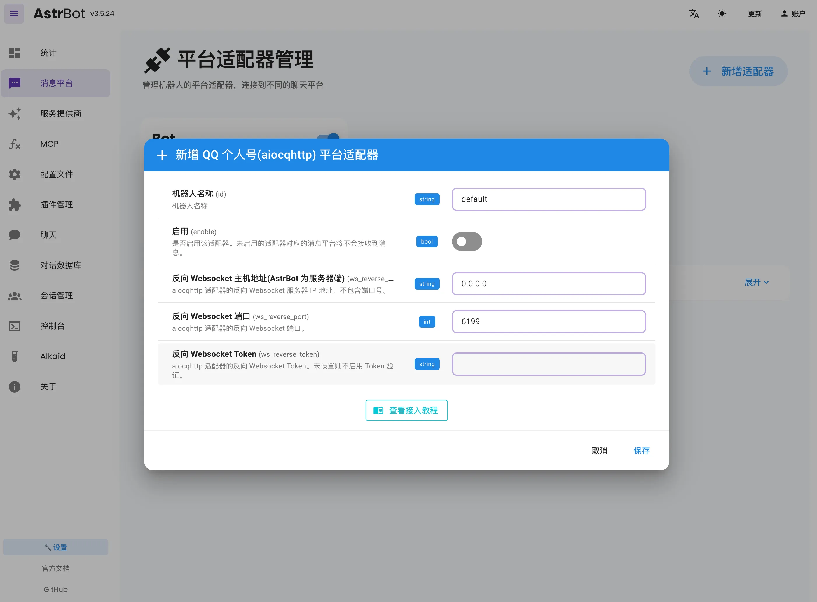 在 消息平台 > 新增适配器 中选择 接入 QQ 个人号(aiocqhttp),按照下图配置即可