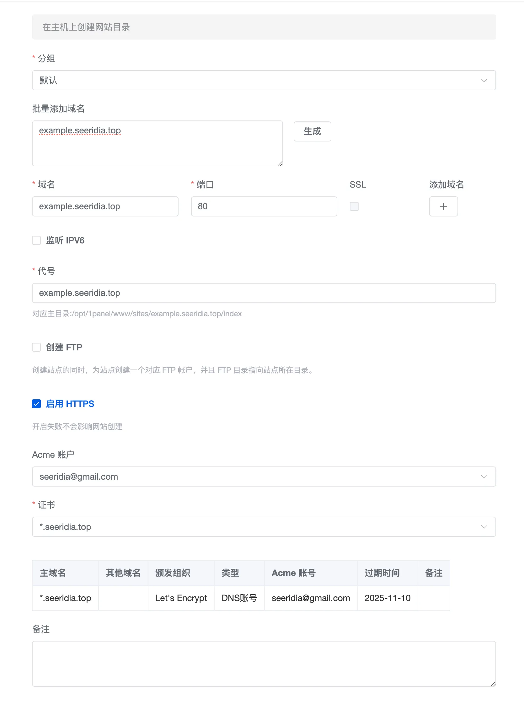 这边要注意一下这边的目录:/opt/1panel/www/sites/example.seeridia.top/index,我们待会配置 Github Actions 的时候要用到。
